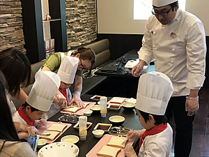 企業・こだわりの食材説明、コック服に着替え、手順説明、作り方お手本、子ども調理、試食、修了証授与・記念撮影など