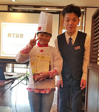 企業・こだわりの食材説明、コック服に着替え、手順説明、作り方お手本、子ども調理、試食、修了証授与・記念撮影など
