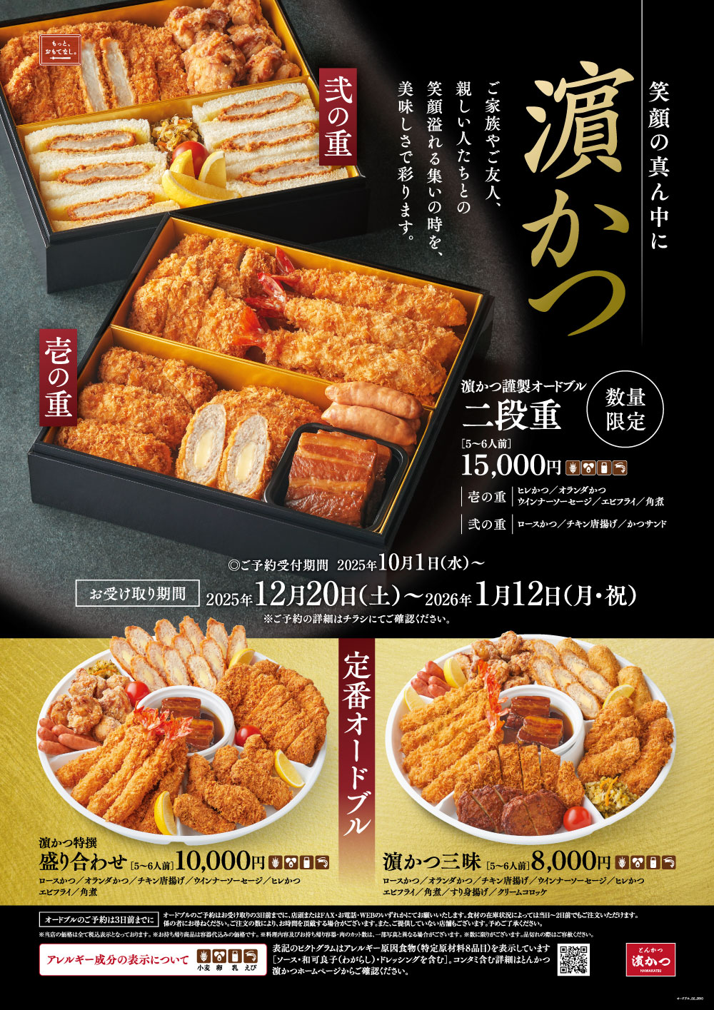 【数量限定】濵かつ謹製オードブル二段重 TOP > メニュー > 地域・店舗限定メニュー > 【数量限定】濵かつ謹製オードブル二段重 ※惣菜店舗除く全店での販売となります。 ※数量限定商品となります。 テイクアウトWEB予約は2025年11月28日(金)より可能です。10月1日(水)~11月27日(木)まではお電話にてご予約を承ります。 ■お近くの店舗はこちら